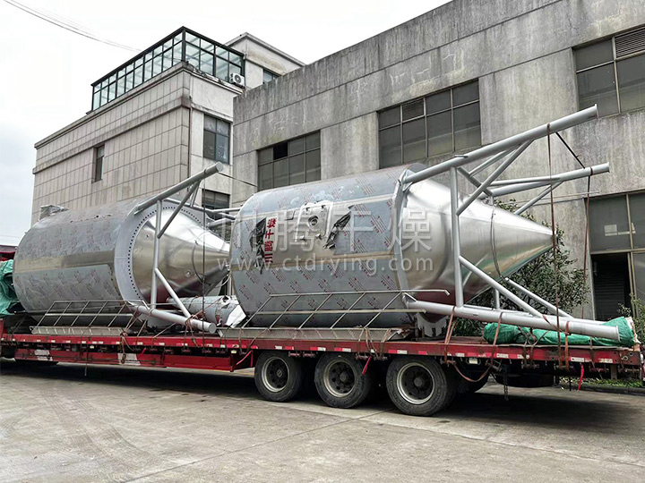 空氣經(jīng)過濾和加熱,進入干燥器頂部空氣分配器,熱空氣呈螺旋狀均勻地進入干燥室。料液經(jīng)塔體頂部的高速離心霧化器,(旋轉(zhuǎn))噴霧成極細微的霧狀液珠,與熱空氣并流接觸在極短的時間內(nèi)可干燥為成品。成品連續(xù)地由干燥塔底部和旋風(fēng)分離器中輸出,廢氣由風(fēng)機排空。